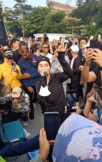 Selain bernyanyi, si pelantun lagu “Alamat Palsu” ini tak lupa menyapa warga Depok dan sekaligus mempromosikan konser tunggalnya yang bertajuk Dangdut Dangdutan.