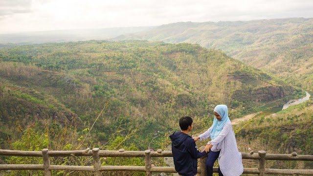 Kami memasuki jalanan sempit yang mengarah pada gerbang objek wisata Kebun Buah Mangunan. Kebun buah ini berada di kawasan Kabupaten Bantul, tepatnya di Jalan Imogiri-Dlingo, Daerah Istimewa Yogyakarta. Meski namanya kebun buah, bukan berarti kami bebas memetik buahnya. Malah tidak dianjurkan. Lagipula, saat aku ke sana, belum ada tanaman yang berbuah. Kami parkir di area parkir yang tidak jauh dari puncak Kebun Buah Mangunan dengan biaya retribusi Rp5.000,00 saja. Dengan jalan menanjak sedikit, kami sudah berada di pinggir panorama yang cantik. Matahari sudah terlanjur tinggi. Namun, karena kami berada di ketinggian 150-200 mdpl, panorama yang terlihat sungguh menyegarkan mata. Masih ada sayup-sayup lembah yang tertutupi awan. Tidak terlalu tebal karena angin menggiringnya ke tempat lain.