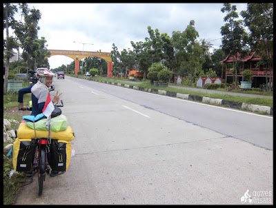 Sekitar pukul 1 siang kami kembali melanjutkan perjalanan kembali menyusuri jalur utama yang lurus-lurus saja, mungkin karena sebelumnya kami telah berkali-kali diguyur hujan dan kondisi cuaca yang tidak jelas “hujan-berhenti-hujan-berhenti” maka pada etape kali ini irama kayuhan sepeda kami berdua mulai menurun