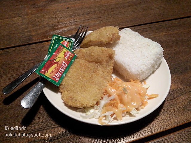 Setelah perundingan alot, kami milih dua menu yang serupa tapi tak sama. Nggak alot juga sih, lihat papan menu langsung nunjuk menu pualing murah, kekekeke. Chicken katsu original dan chicken katsu kari. Harganya sama, 13ribu udah dapet nasi, salad, dan es teh! Busyett!
