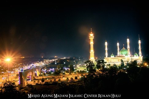 | GEMERLAP. Komplek Masjid Agung Madani Islamic Center (MAMIC) Rokan Hulu tampak gemerlap dengan sinar lampu di malam hari |