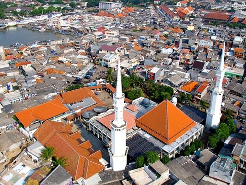 | Menara Masjid Luar Batang menjulang diantara bangunan disekitarnya. |