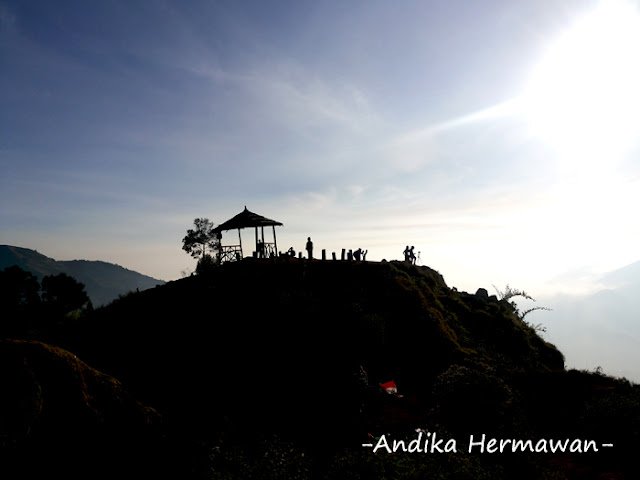 Setibanya di puncak, saya mengambil posisi duduk untuk mengistirahatkan badan dan meluruskan kaki. Pemandangan Gunung Sindoro nampak begitu jelas di depan kami. Banyak pengunjung langsung menyiapkan kamera dan ponsel mereka untuk mengabadikan momen pagi itu. Semburat warna orange tampak membelah cakrawala di ufuk timur. Seolah tak mau ketinggalan momen, pengunjung pun sibuk memainkan gadget mereka. Ada yang mengambil gambar pemandangan alam, tak sedikit pula yang mengabadikan diri dengan berbagai macam pose dengan latar belakang pemandangan matahari terbit.