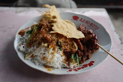 Saya aduk perlahan sayuran dan bumbu merata, bumbu ini sesuai dengan jumlah sayurannya. Lidah saya berontak bahagia, sayurannya masih kreznyez saat digigit, daun pepayanya tidak ada rasa pahit sama sekali, bumbu kacangnya gurih luar biasa dan pedasnya saya suka, ada sedikit rasa kencur yang membalut bumbu ini. Begitu sedap dengan tambahan kriuk kriuk dari peyek kacang yang nikmat. Saya menikmati perpaduan ini dengan tambahan sate hati yang pedas, manis dan gurih serta dibalut dengan rasa bawang putih dan ketumbar yang pasti pas untuk makanan yang dibakar.
