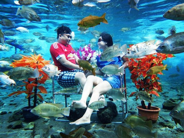 untuk harga tiketnya sendiri sekitar 15.000 ribu per orangnya. disini juga menyediakan peralatan snorkeling dan diving dengan harga sewa sekitar 12.000 ribu rupiah untuk snorkeling, kaki katak 7.000 ribu rupiah, pelampung 7.000 ribu rupiah dan 5.000 ribu rupiah untuk sewa ban. jika pengunjung ingin berfoto di dawah air dapat juga menyewa kamera dengan harga 60.000 dengan waktu 30 menit dan 100.000 ribu rupiah per 60 menit. dapat juga berfoto group dengan di foto oleh para fotografer dengan harga 100.000 perjam nya dengan 7 orang. untuk tarif parkir wisata sekitar 2.000 ribu rupiah untuk kendaraan roda dua dan 4.000 ribu rupiah untuk roda empat. kamar mandi untuk membilas juga membutuhkan biaya 1.000 ribu rupiah per orangnya. penyewaan spot-spot foto yang berada di bawah kolam di sewa dengan harga kurang lebih 100.000 ribu rupiah. harga tergantung spot apa yang di pakai untuk berfoto bersama teman.
